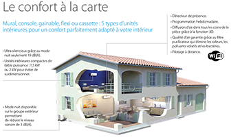 Pour une seule pièce, choisissez un climatiseur mono split. Pour plusieurs pièces, prenez un climatiseur multi split, avec jusqu’à cinq unités intérieures différentes (froid seul ou réversible) : mural; console, gainable, flexi ou cassette.