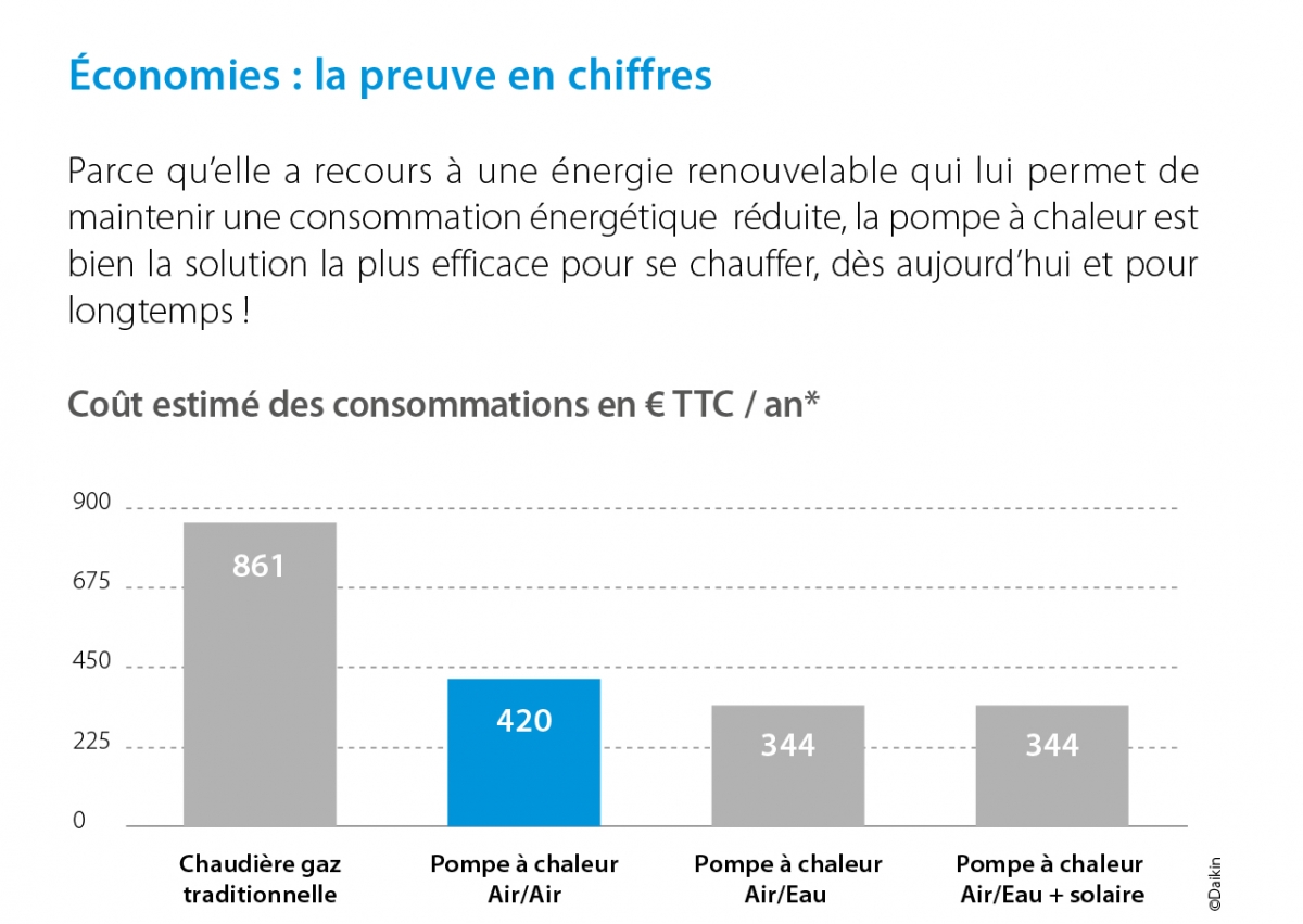 Le faible coût de consommation d’une climatisation réversible en fait une des énergies les moins coûteuses du marché. Pour sa production de chaleur, elle consomme 30% à 30% d’électricité, et à 70% les calories contenues dans l’air extérieur, énergie gratuite et renouvelable.